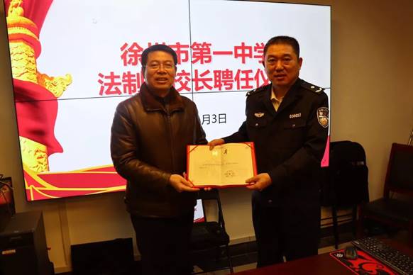 1月3日上午,徐州一中法製副校長聘任儀式在市公安局舉行。魏全星副校長代(dài)表徐州一(yī)中向市公安局孫益龍副局長頒發了法製副校(xiào)長聘書(shū)。
