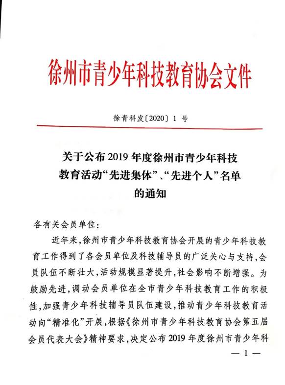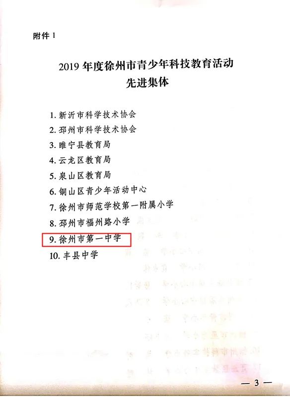 近日,2019年度徐州市青少年(nián)科(kē)技教育活動先進集(jí)體、先進個人名單公(gōng)布,徐州一中榮獲青少(shǎo)年科技教育活動先進集體。