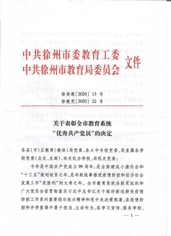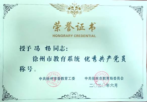 日前,市委教(jiāo)育工委、市教育局黨委(wěi)共同(tóng)下發了《關於表彰全市教育係統優(yōu)秀共產黨員的決定》,表彰全市100位教育係統(tǒng)優秀共產黨員(yuán)。我校(xiào)2017級黨支部馮楊(yáng)同誌被授予“優(yōu)秀共產黨員”稱號。