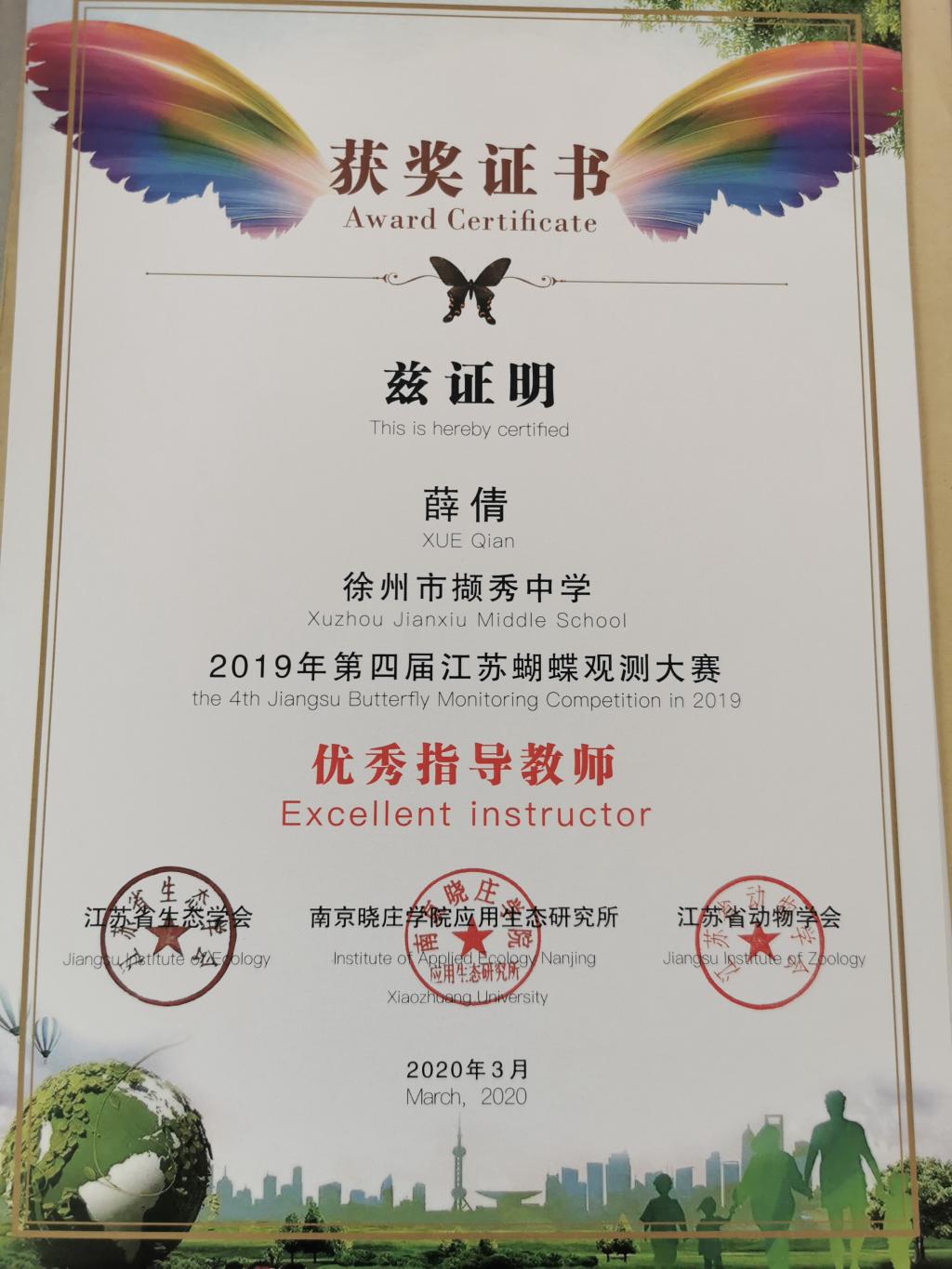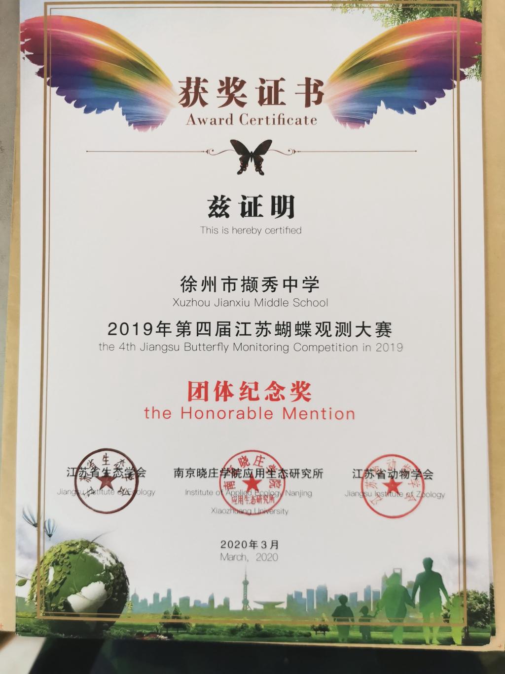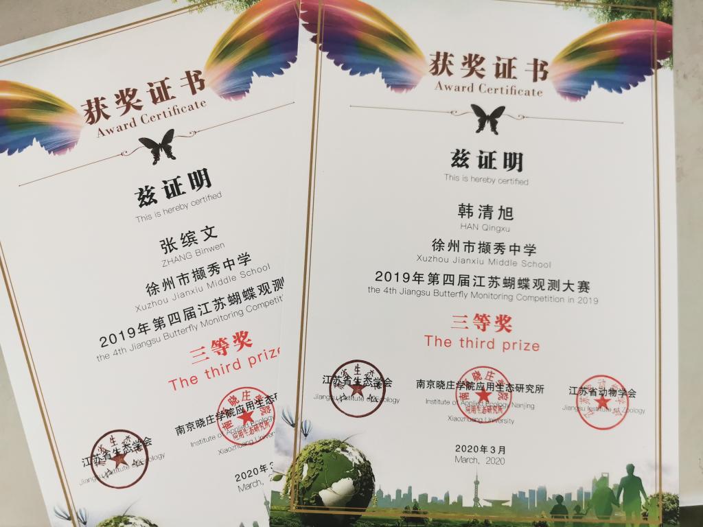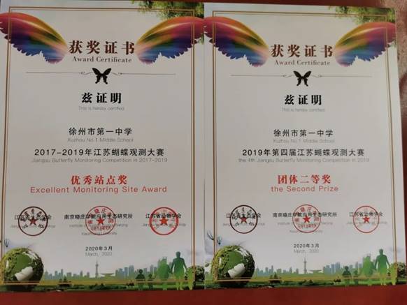 我校生物學科組教師組織同學走出校門,走進大自然,進行了“江蘇蝴蝶觀(guān)測大賽”活動,活動成果得到江(jiāng)蘇蝴蝶監測中(zhōng)心的肯定。詹昕荻等17位同學獲得(dé)個人獎項,郭軍(jun1)英、袁維娜等4位教師獲得優秀指導(dǎo)教師獎,徐州一中獲得2019年第四屆江蘇蝴蝶觀(guān)測大賽團體二等獎(jiǎng),同時獲得2017—2019年江蘇蝴蝶觀測大賽優秀站點獎。