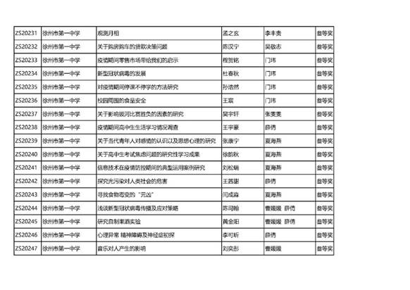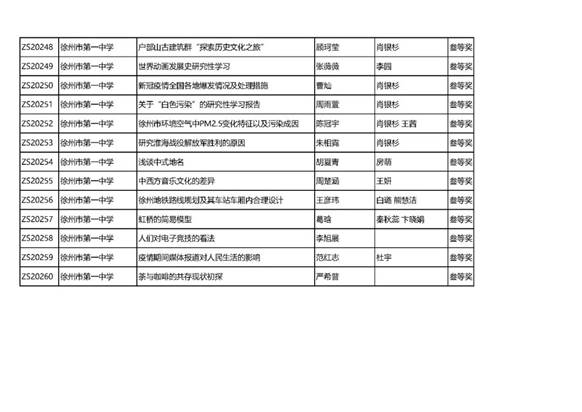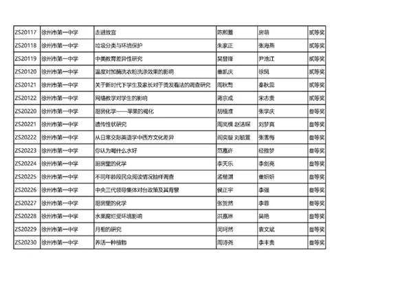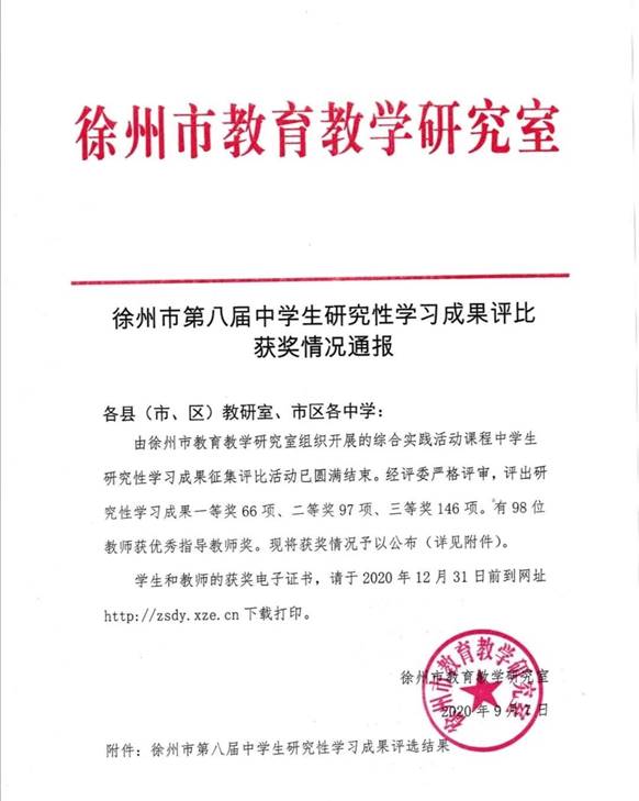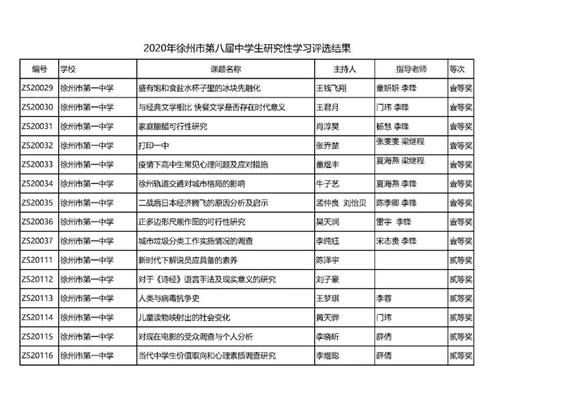 徐州市第(dì)八屆中學生研究性學習成果評比結(jié)果揭曉,我校共獲得9個一等獎,12個二等獎,41個三等獎(jiǎng)的好成績。向獲獎同學與指(zhǐ)導老師(shī)表示祝賀!
