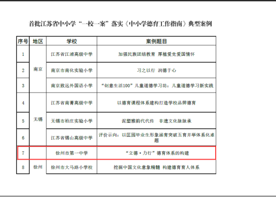 近日,江(jiāng)蘇省教育廳發布相關文件,在各(gè)地遴(lín)選推薦的基礎上,經專家評審,徐州一中“‘立(lì)德力行’德育體係的(de)構建(jiàn)”確定為(wéi)首批中小學“一校一案”落實《中小學德(dé)育工作指南》典型案例。