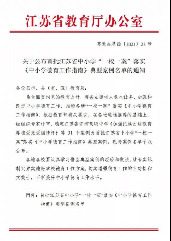 近日,江蘇省教育廳發布相關文件,在(zài)各地遴選推薦的基礎上,經專(zhuān)家評審,徐州(zhōu)一中“‘立德力(lì)行’德育(yù)體係的(de)構建”確定為(wéi)首批中小學(xué)“一校一案”落實《中小學德育工作指南(nán)》典型案(àn)例。