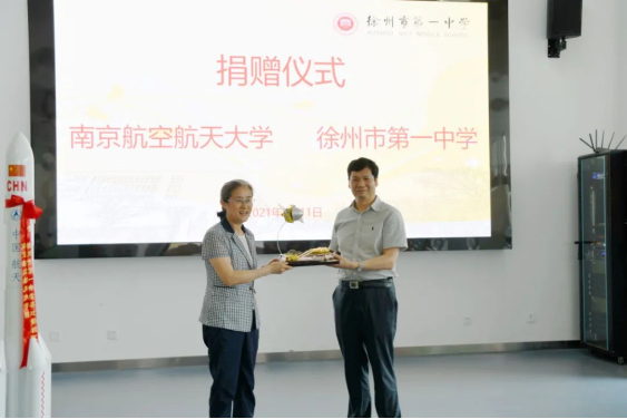 6月11日,南京航空航天大學黨委書記鄭永(yǒng)安帶隊蒞臨徐州一中,並向我校捐贈長(zhǎng)征五號運載火箭(1:40)和天問一號火星探測器(1:30)實(shí)物(wù)模型。我校陳青校長、葉弘(hóng)媚副校長等(děng)共同(tóng)參加了捐贈儀式(shì)。儀式(shì)由葉弘媚副校長主持。