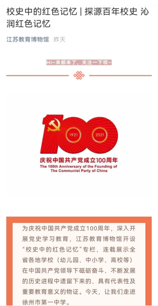 由江蘇教育博物館策劃推出的《校史中的紅色記憶》專題係列之《徐州一中:探源百年校史,沁潤紅色記憶》,於9月28日在江蘇教育博(bó)物館微信公眾號發布。通過發掘校史中的紅色(sè)資源、紅色基因,連載展示全省各地(dì)學校在中(zhōng)國(guó)共產黨領導下砥(dǐ)礪奮鬥(dòu)、不(bú)斷發展的(de)曆史進程中遺留下來的、具有代表性及重要教育意義的物證。