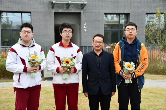 ▲化學總教(jiāo)練張幫程與3位省隊隊員(左起:周韋屹、朱奕(yì)軒、張翔俁)