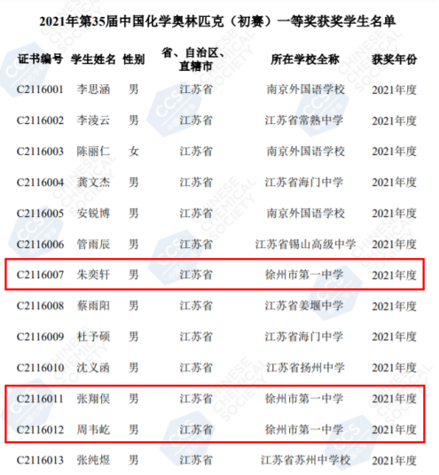 在此,向獲獎同學表示祝賀!向付出(chū)辛(xīn)勞智慧的教練員表示祝(zhù)賀(hè)!祝願朱奕軒、張翔俁、周韋屹3位同學在接(jiē)下來的全國化學(xué)決賽中再創佳績!祝願徐州一中化學奧賽隊勇攀高峰,再創輝煌(huáng)!