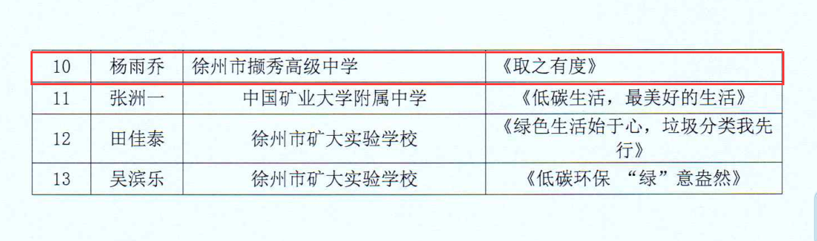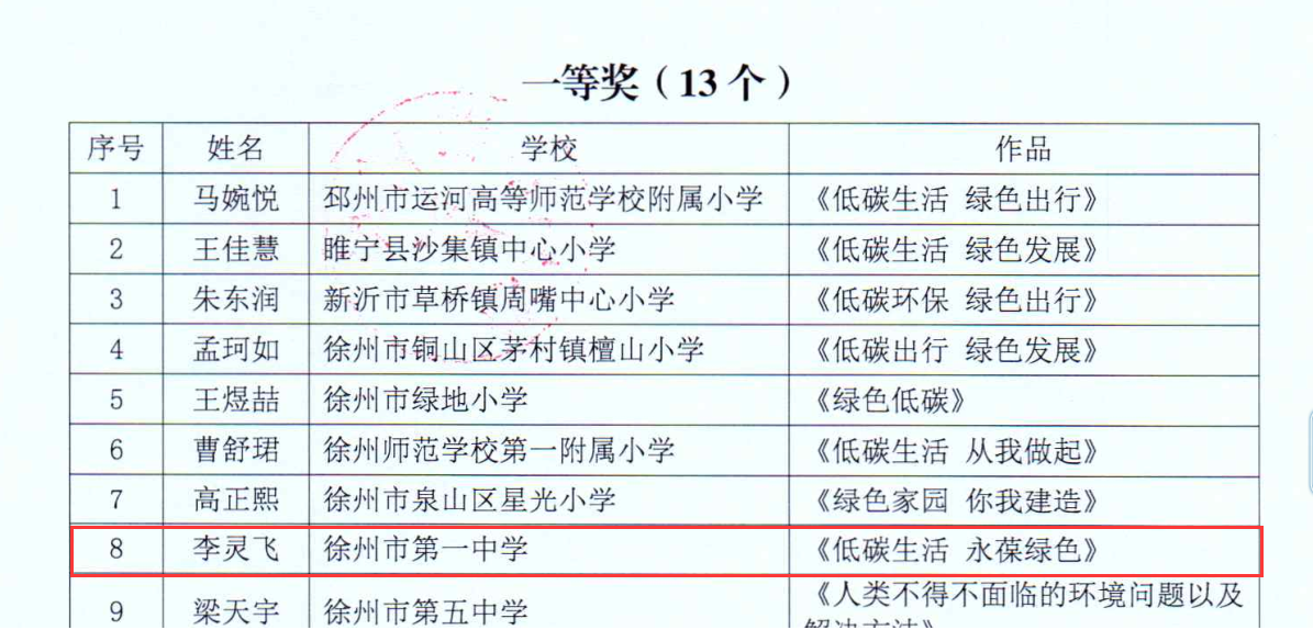近日,市教育局公布了徐州市首屆“低碳生活、綠色發展”青少年社會實踐(jiàn)活動獲獎名單,我校(xiào)李靈飛、楊雨喬兩位同學獲一等獎,杜文娟、郭玉婕兩位老師獲優秀指導教師獎,向以上獲獎師生表示祝(zhù)賀。