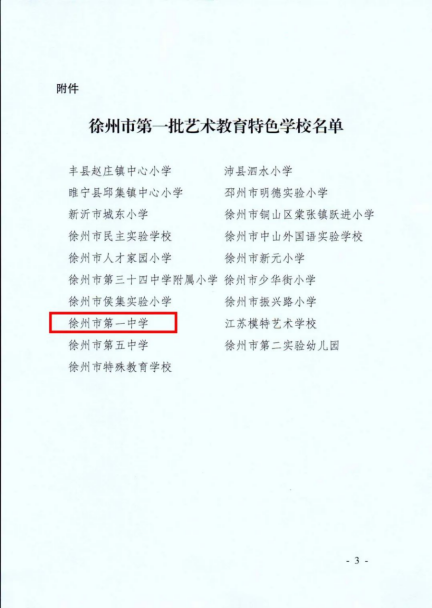 近日,市教育局發布《關(guān)於公布徐州(zhōu)市藝術教育特色學校名單的通知》,經專家組評(píng)定,考核合格,我校被評為“徐州市第一批藝術(shù)教育特色學校”。