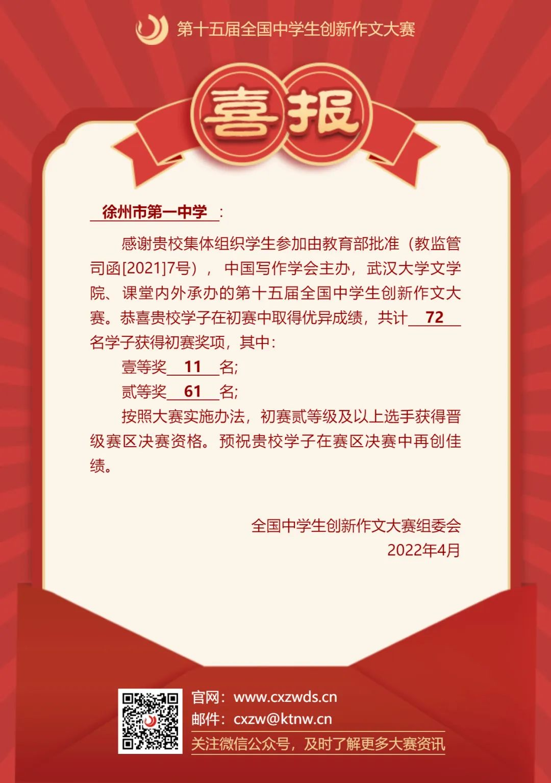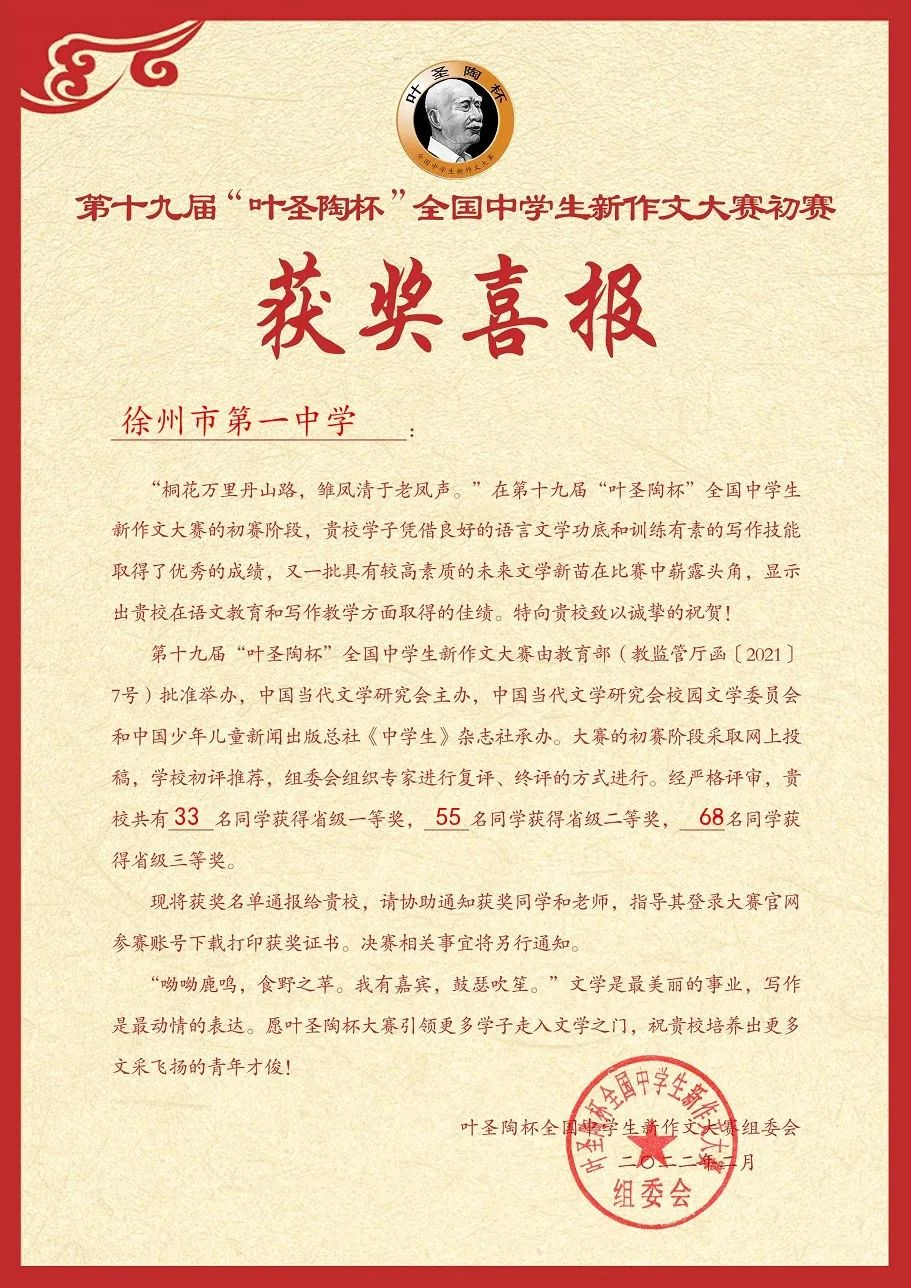 今年2月,在第十九屆葉聖陶杯新作文大(dà)賽中,一中(zhōng)學子同樣取得了耀眼的成績。33個省級一等獎,52個省級二等級,68個省級三等獎,20位教師獲指(zhǐ)導教師省級(jí)一等獎,徐州一中榮獲“優秀(xiù)團體獎”。15人入圍(wéi)全國決賽。