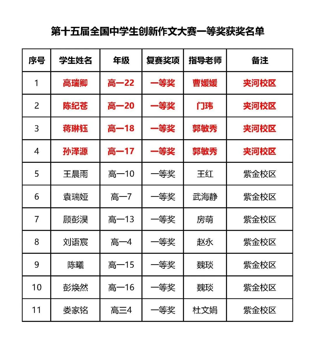 特別值得一提的是,夾河校區(qū)師生在此次作文大賽中表現出色,11個創新杯一等獎,其中夾河校區4人,分別(bié)是(shì):高瑞卿(指導老師:曹媛媛)陳紀蒼(指導老師:門瑋)蔣琳鈺(指(zhǐ)導老師:郭敏秀)、孫澤源(指導老師:郭敏秀)。葉聖陶杯進(jìn)入全國決賽的15人中,夾(jiá)河校區6人,分別是蘇祺然(rán)(指導(dǎo)老師:史穎)、鄒韞輝(指導老師:郭敏(mǐn)秀)、王宇彤(指導老師:門瑋(wěi))、徐乙禾(指導(dǎo)老師:門瑋)、李欣桐(tóng)(指導老師:馮媛)、劉(liú)子豪(指導老師:肖銀杉)