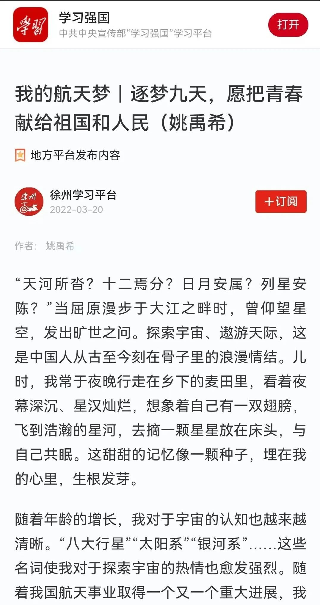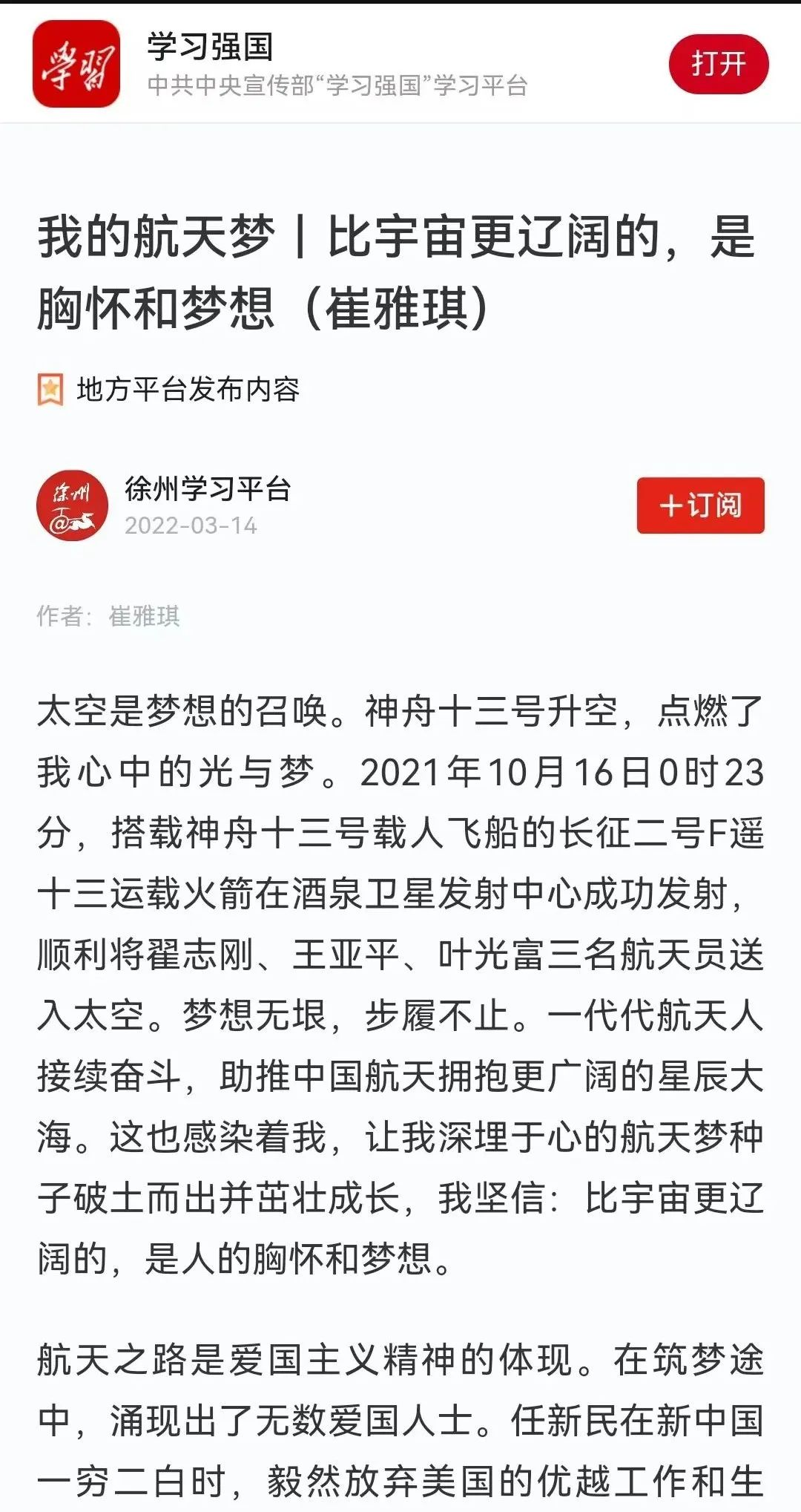 除了(le)在全國(guó)作文(wén)大賽中折桂,一中(zhōng)學(xué)子的優秀習(xí)作也頻頻登上學習強國。2022年3月,崔雅琪同(tóng)學的文章《比(bǐ)宇宙更遼闊的(de),是胸懷和夢想》,姚禹希同學的文章《逐夢九(jiǔ)天,願把青春獻給(gěi)祖國和人民(mín)》先後被“學習強國”平台采用。