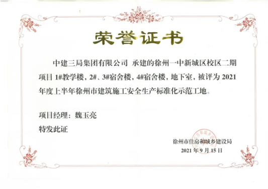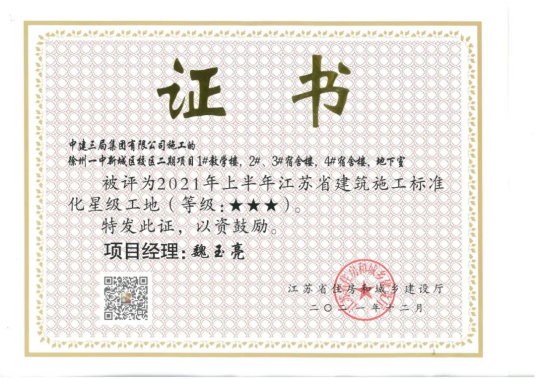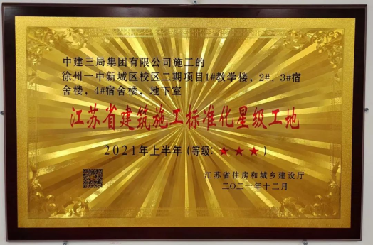 新校區二期工程建設工程傳來喜訊!由中建(jiàn)三局集團有限公司承建的我校新城區校區二期工程(chéng)榮獲“2021年上半年江蘇省建築施工標準化星級工地”(三星)稱號。這是繼該項目榮獲徐州市“2021年(nián)度上半年建築施工安全生產標(biāo)準化示(shì)範(fàn)工地”稱號後斬獲的又一殊榮。