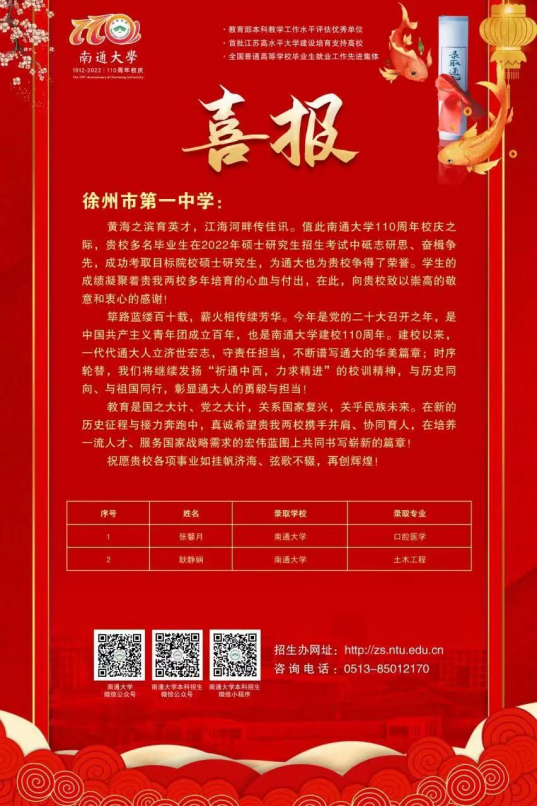 近日,南(nán)通大(dà)學發來喜報。徐州一中張馨月、耿(gěng)靜嫻兩位砥誌研思、奮輯爭先,成功考取目標院校研究(jiū)生。