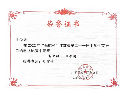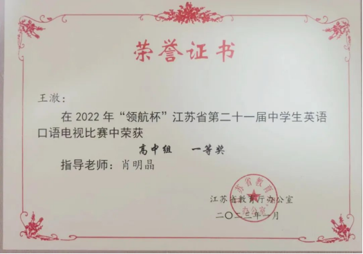 在第二十(shí)一(yī)屆“領航杯”江蘇省中學生英語口語電視(shì)比(bǐ)賽中,我校學子經過層層角逐,斬獲(huò)佳績。高一14班王澈獲一等獎,高一17班李思瑤(擷秀高中)獲二等獎!向獲獎學生向以上獲獎同學表示熱烈祝賀!