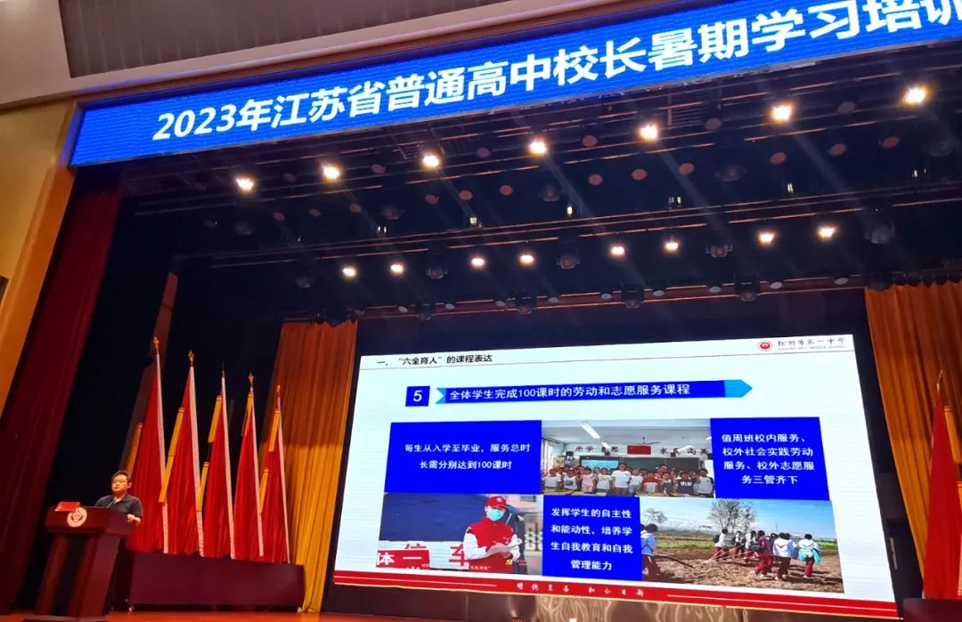 8月(yuè)16日-18日,2023年江蘇(sū)省(shěng)普通高(gāo)中校長暑期學習培訓班在揚(yáng)州舉行。教(jiāo)育部基(jī)礎教育司一級巡視員於長學作專題報告,省教育廳廳長、黨組書記、省委教育工委書記(jì)江湧作主旨報告,省教育廳副廳(tīng)長顧月華作會議總結(jié)講話。本次培訓班(bān)的主題是深入學習(xí)貫徹習近平總書(shū)記考(kǎo)察江蘇和在中央政治局第五(wǔ)次集體學習時的重要講話精神,認真落(luò)實黨中央和省委省政府關於基礎教育特別是普通高中教育的決策部署,推進江蘇普通高中教育高質量發展走在前、作示範。培訓會上,徐州一中黨委書記秦曉華以《“六全(quán)育人”的課(kè)程與教(jiāo)學表達》為題作經驗交流。