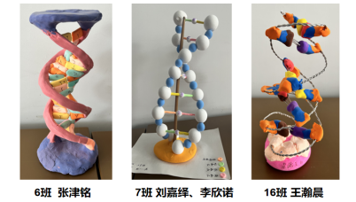 同(tóng)學們一呼百應,比賽進行的如火如荼。在上交的一百多份作品中,2班張丹好、4班董明赫、6班張津銘(míng)、7班劉嘉繹(yì)、16班王(wáng)瀚晨的作品設計具有特色(sè)且精美,在比(bǐ)賽中獲得一等獎(jiǎng)。二(èr)等獎中,4班段珺凱同學利用廢舊筆芯做成(chéng)堿基對的化學式和分子模型,創意新穎。15班王思語利用廢舊卡紙做成DNA平麵分(fèn)子長鏈,十分震撼。部分精彩作品(pǐn)展示如下: