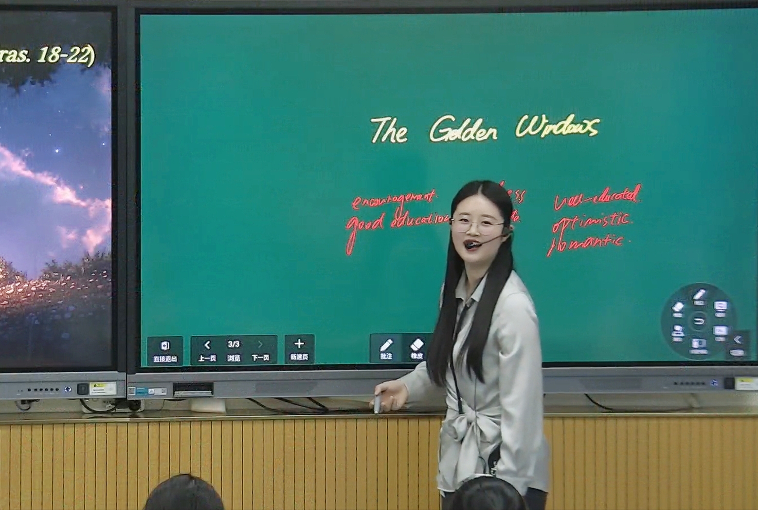 B組以“The golden windows(金色的窗戶)”為主題。張雅軒老師授課中以寓言式文本(běn)為(wéi)鏡,融合場景化(huà)細讀與角色扮演,巧妙引導學生跨越理性與(yǔ)情感的鴻溝。從“微信朋友圈”的現實共鳴切入,到“金色窗(chuāng)戶”的象征解碼,層層遞進的問題鏈激發學生深度(dù)思辨,多(duō)模態任務讓文學照見生活,語言浸潤心靈。
