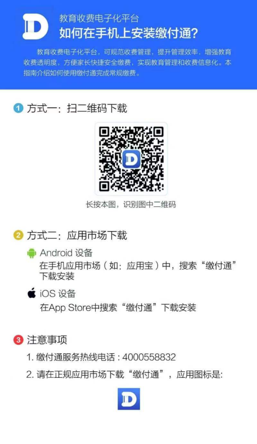 根據2019年財政非稅係統直繳改革的要求,繳費需要實行“一人一繳款碼”的形式繳費,為簡化繳費流程,本學期(qī)繼續使用手機“繳付通(tōng)”APP平台進(jìn)行繳費,不再接受現金等其它(tā)方式的(de)繳費,繳(jiǎo)費要求如下: