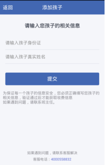 2. 填寫您孩子正(zhèng)確的身份證號(hào)和姓名,完成後點擊提交( 每個賬號下(xià),可以同時綁定三個孩子,繳費後可以注(zhù)銷再綁定其他孩子)。