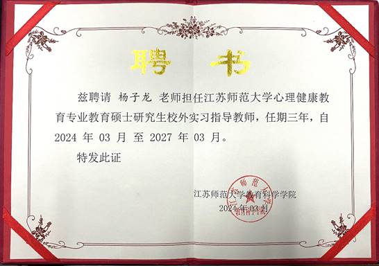 楊子龍老師受聘擔任江蘇師範大學(xué)教育科學學院心(xīn)理健康教育專業教育碩士研究生校(xiào)外實習指導教師。