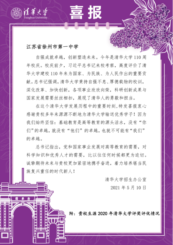 2021年(nián)5月10日,清華(huá)大學在慶祝建校110周年之際,向(xiàng)徐州一中發來賀信,感謝徐州一中多年來源源不斷地為清華大學(xué)輸送優秀學子。徐(xú)州一(yī)中畢(bì)業生的持續發展能力,良好(hǎo)的(de)綜合素養再次受到國內頂尖高校的高度認可(kě)!畢業學長們的榜樣(yàng)力量正激勵著徐州一中莘莘學(xué)子,努力成長為堪當民(mín)族(zú)複(fù)興大任的(de)一代新青年。