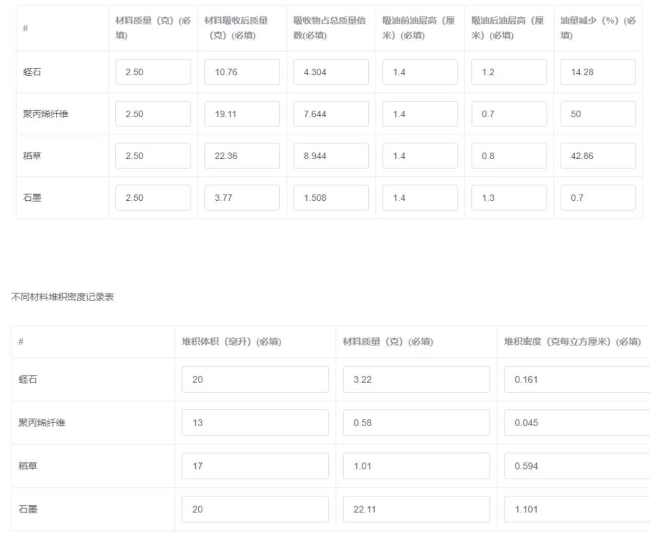 6)計算每種材料吸油(yóu)後油量減(jiǎn)少的比例(油量減(jiǎn)少% =(吸油前油體積 - 吸油後油體積)/吸油前油體積×100% ,假設油密度均勻,可用油層高度計算體積 )以及吸收物占總質量倍數(吸收物占總(zǒng)質量倍數=材料吸收後質量/材料質量 )。
