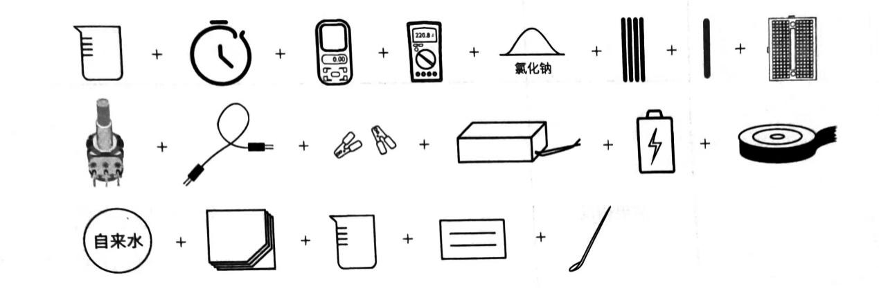 本實驗選取的實驗材(cái)料是量筒、秒表、數(shù)字(zì)萬用(yòng)表(或多用表)、萬用表 、氯化鈉(藥品 )、電極(或(huò)金屬棒)、玻璃棒、麵包板、電位器、電源線、鱷魚夾、電池、絕緣膠帶、自來(lái)水(shuǐ)(液體材料) 、紙巾、小(xiǎo)量筒、標簽紙、藥勺 。