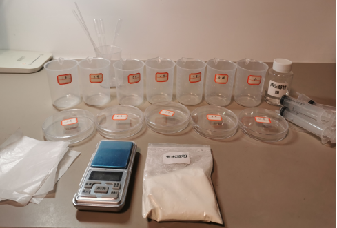 (3)流延成膜:用注射器吸取混合液15mlL (控製每組(zǔ)流延體積一致(zhì)),小心將其轉移至貼有(yǒu)對應編號(hào)的塑料培養皿(mǐn)中流延製膜,盡可能使其(qí)分布平整,用牙簽等工具小心(xīn)戳破明顯的氣泡。