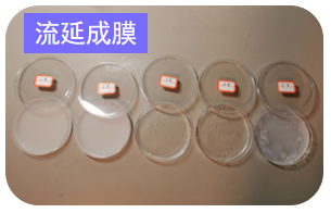 (4)流延成(chéng)膜:用注射器吸取混合液15mL(控製每組流延體(tǐ)積一致)小心將其轉移至貼有對應編號的塑料培養皿中(zhōng)流(liú)延製膜盡可能使其分布平整。