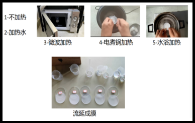 3、微波加熱、電煮鍋加熱及水浴加熱條(tiáo)件下均能實現(xiàn)混合(hé)液微沸狀態,能夠保證其充分糊化,因(yīn)而可以(yǐ)成膜。