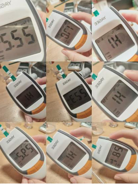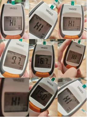 這次的實驗,我感受頗深。首先,我(wǒ)有些笨手笨腳的,每次計時和測量時都有(yǒu)些緊張和手忙(máng)腳亂,這也許就是我數據異常的原因(yīn)。其次,每次我揣著(zhe)好(hǎo)奇與期待,看著血糖儀“5,4,3,2,1”直到出現結果,但大多(duō)數時候都是失敗告終,失敗(bài)的次數多了(如下圖)真的很苦惱,當最後(hòu)幾次數據漸漸正常的時候,有一種苦盡甘來的喜悅。