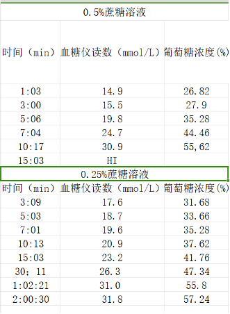 (4)測量溶液葡萄糖濃度:為了精確讀數,本實驗使(shǐ)用家用血(xuè)糖儀對溶(róng)液的葡萄(táo)糖濃度進行檢測,在啟動計時器(qì)後的約第1、3、5、7、10、15、30、60、120、240、360、480分鍾進(jìn)行測試,將測量結果(guǒ)與對(duì)應(yīng)時間(建議詳細到秒)記錄在本上。